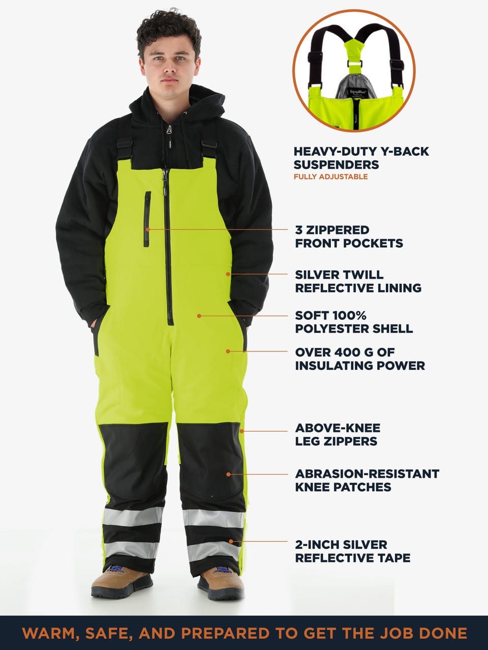 These HiVis Insulated Softshell Bib Overalls give you the durability, functionality and warmth you need to get the toughest jobs done in any conditions down to -20°F. Plus, bright colors and reflective tape on these thermal work overalls give you the visibility you need to stay seen and stay safe in high traffic, low light or crazy weather.
