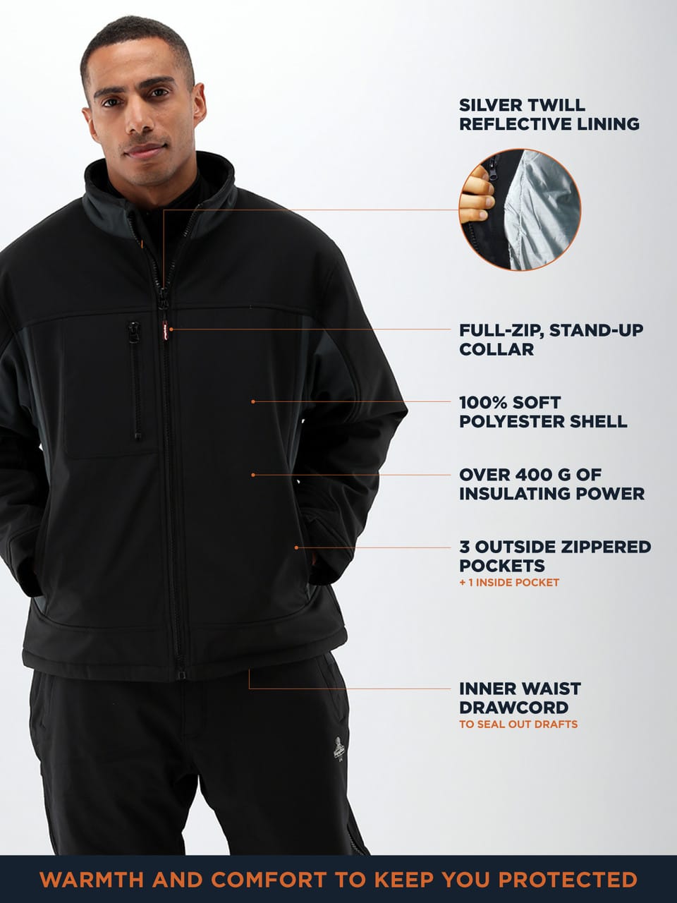 - Get serious protection and warmth in extreme cold conditions down to -20°F with 400g of insulating power. The silver twill reflective lining of this thermal work coat also works to capture escaping body heat and reflect it back to you for additional warmth. This insulated softshell jacket is water-repellent and wind-tight so you can outlast any storm.